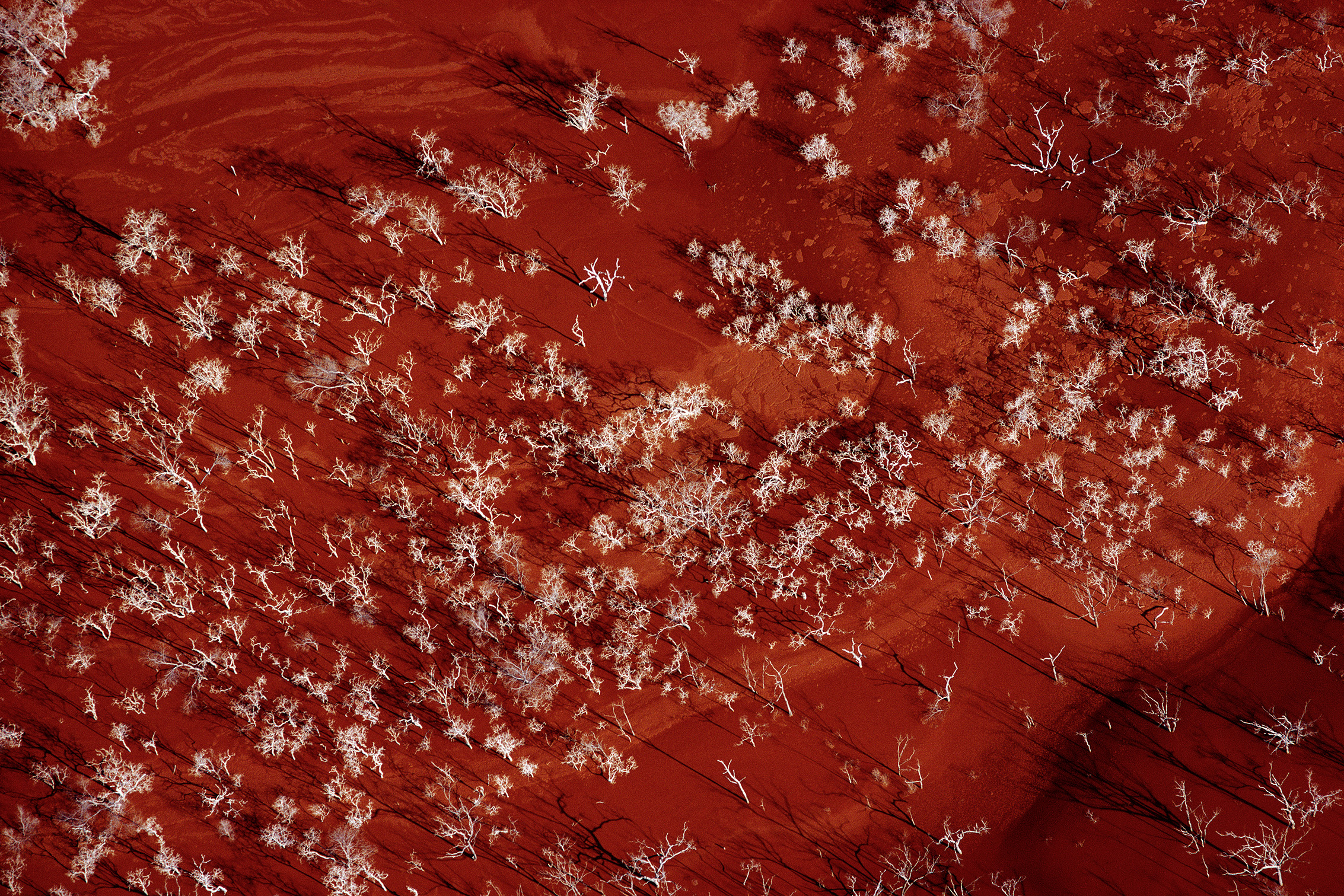 Die Aluminiumindustrie hat Mühe, den (ungiftigen) Rotschalmm an den Mann zu bringen. So entstehen die Rotschlamm-Deponien, die immer wieder Anlass von mehr oder weniger sachlichen Umweltschutzdiskussionen werden - vielleicht deshalb, weil sie in der Landschaft so aggressive Farbsignale setzen. Wenn sie voll sind, werden die Deponien rekultiviert und begrünt. Die Geisgterbäume in der Rotschlamm-Lagunde im Tonerdewerk von Gove sind die Skelette von Eukalypten und Mangroven.